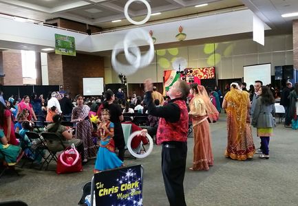 Here I am juggling 4 rings at the Southfield Civic Center. Large crowds gathered for a festival celebration. Children watched me do magic tricks and juggling. I am their favorite Michigan magician. I also have audience participation with the juggling. I bring a audience member up to spin a juggling ring on their arm with me. I also toss them one of my juggling balls while I juggle three. Then I continue juggling and tossing one to them too. They are helping keep the juggling pattern going.
